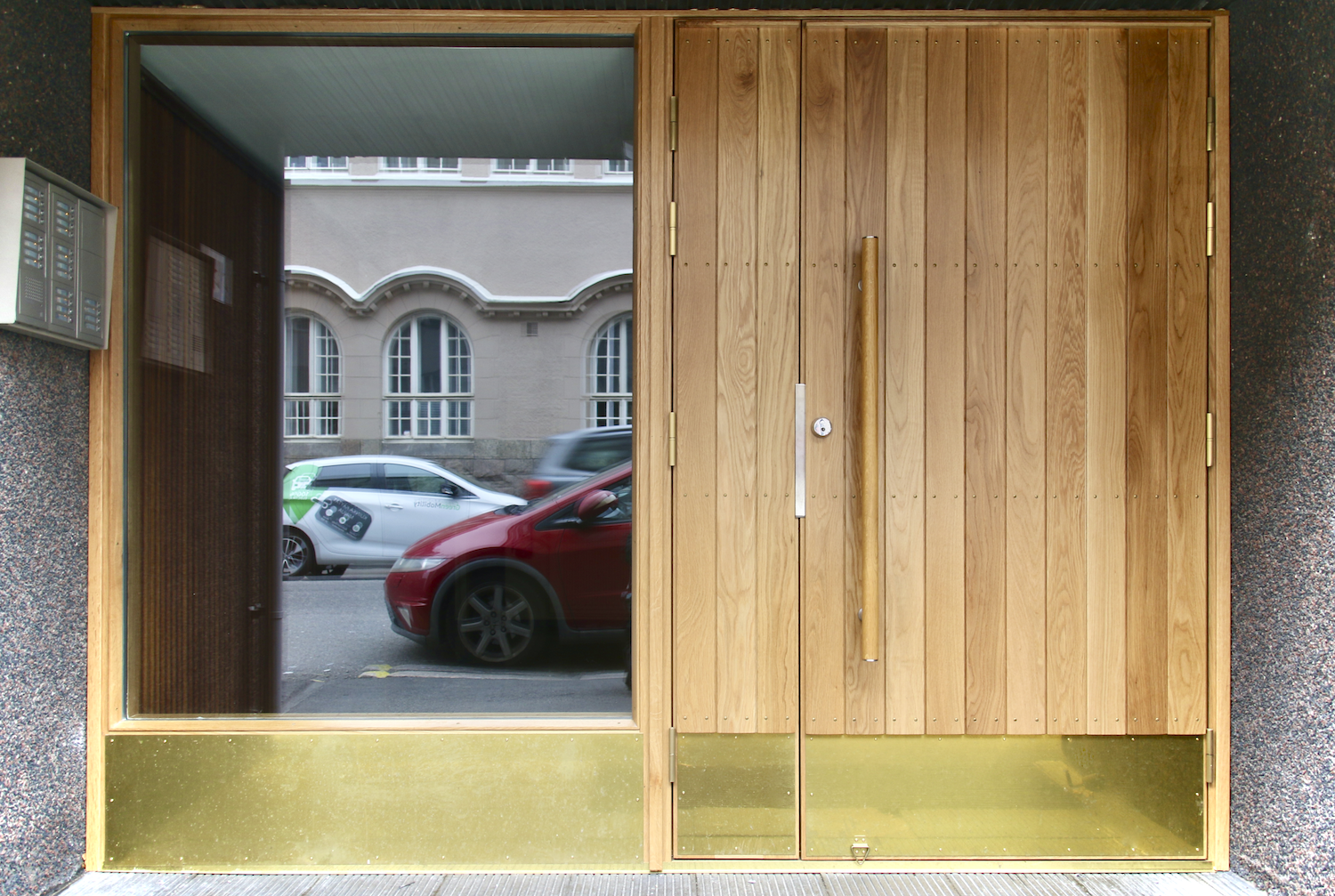 Ratakadulla Helsingissä sijaitsevan taloyhtiön massiivipuisten ulko-ovien pintaa koristaa tammipaneli.